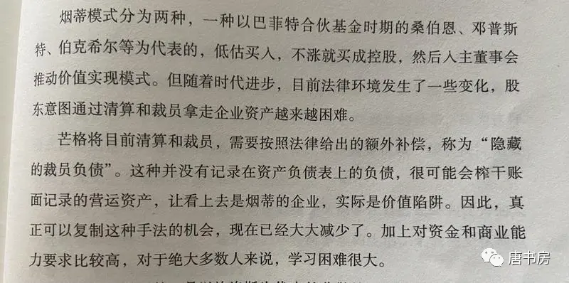 巴神的回复是:“如果你能找到足够数量、符合条件的烟蒂,你的收益会很好。但我估计今天的环境下,很难找到了。”芒格则提出了一个很少有人注意到的烟蒂股投资文化的变化,见巴芒演义341页这段(图三)