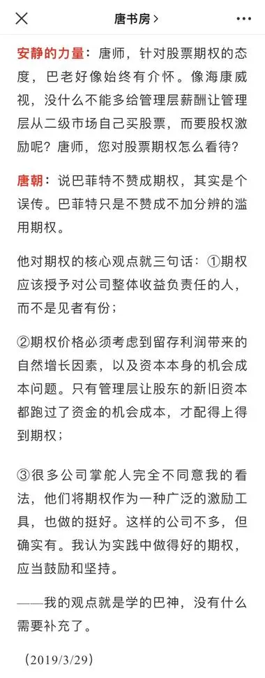 唐朝:巴神对期权的观点,经常被误解为是反对使用期权,其实不是。(巴神的期权观见下图)。