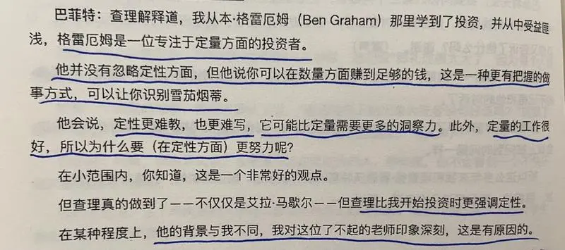 巴菲特首先声明了格雷厄姆并不是不懂定性,他只是认为单纯的定量已经足够赚到满意的回报(他那个时代),而且很简单很容易学习,普通人没有必要在更难的事情(定性)上去努力。