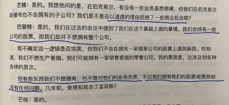 IE:这段“佛教里面有个对居士的退而求其次的要求,可以吃肉,但只吃三净肉。所谓三净肉就是不见杀、不闻杀、不为我杀。巴神这个类似,控股经营烟草企业,相当于有些罪孽是我亲手做的。而我买不买烟草企业的股票,烟草企业本身就在那么运转。我只是赚了市场对手的钱,相当于吃了三净肉。”2021年10月20日