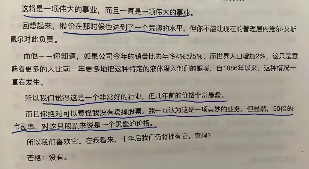 唐朝:回顾可口可乐:(1998年)股价达到了一种荒谬的水平。你可以责怪我没有那时卖掉它,虽然它是一项美妙的业务,但50倍市盈率依然是个愚蠢的价格(可惜我没有抓住机会利用市场的愚蠢)。