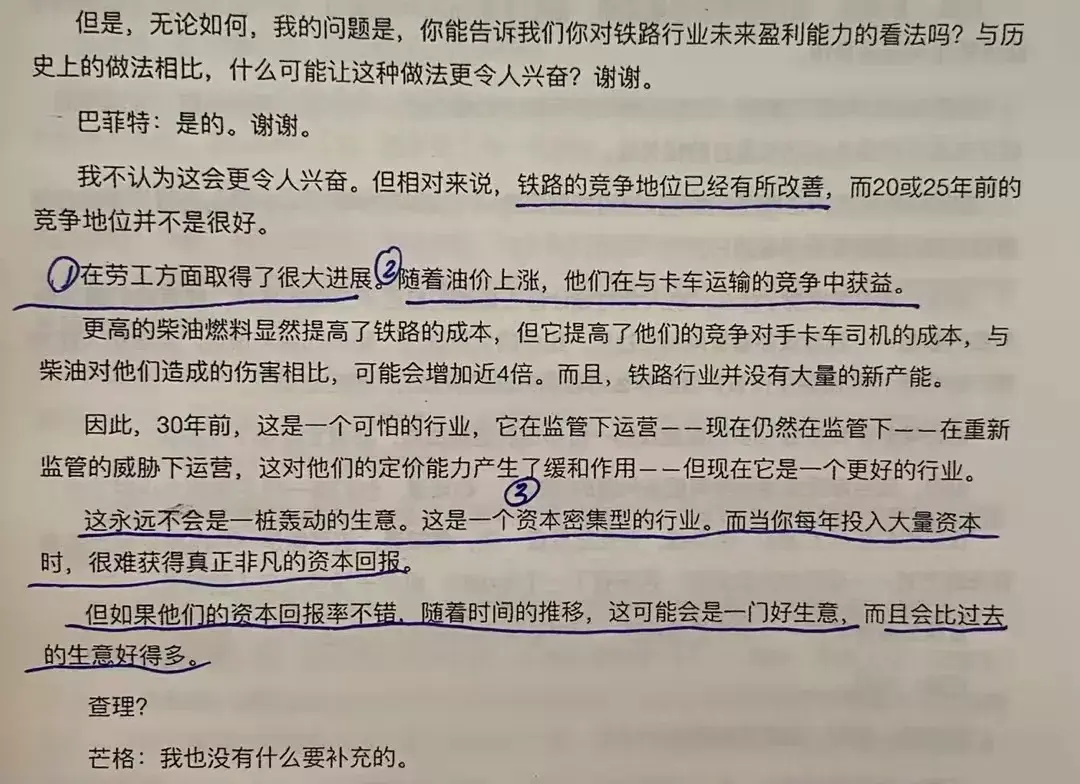 唐朝:巴神关注铁路的原因:一是劳工方面取得了很大的进展,这块不太清楚详细情况;二是油价上涨对卡车运输的伤害更大,相对而言,铁路受伤较小,与卡车之间的竞争地位有了一些改善;三是铁路是资本密集型企业,如果恰巧资本太多,铁路可以容纳的下。