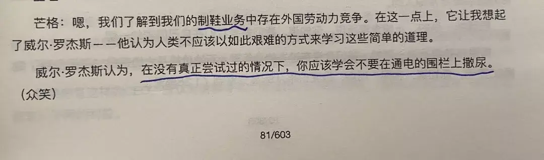 唐朝:让我们用一个史上最愚蠢的回顾结束今天的阅读吧,手机又没电了—胖子同一个坑里摔倒了两次。黑牛:是史上最愚蠢之一,没有最蠢,只有更蠢…鲤鱼:老巴是个好领导。伯涵:领导的艺术:有问题我来扛,有功劳是大家的。