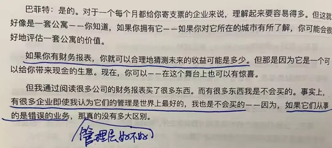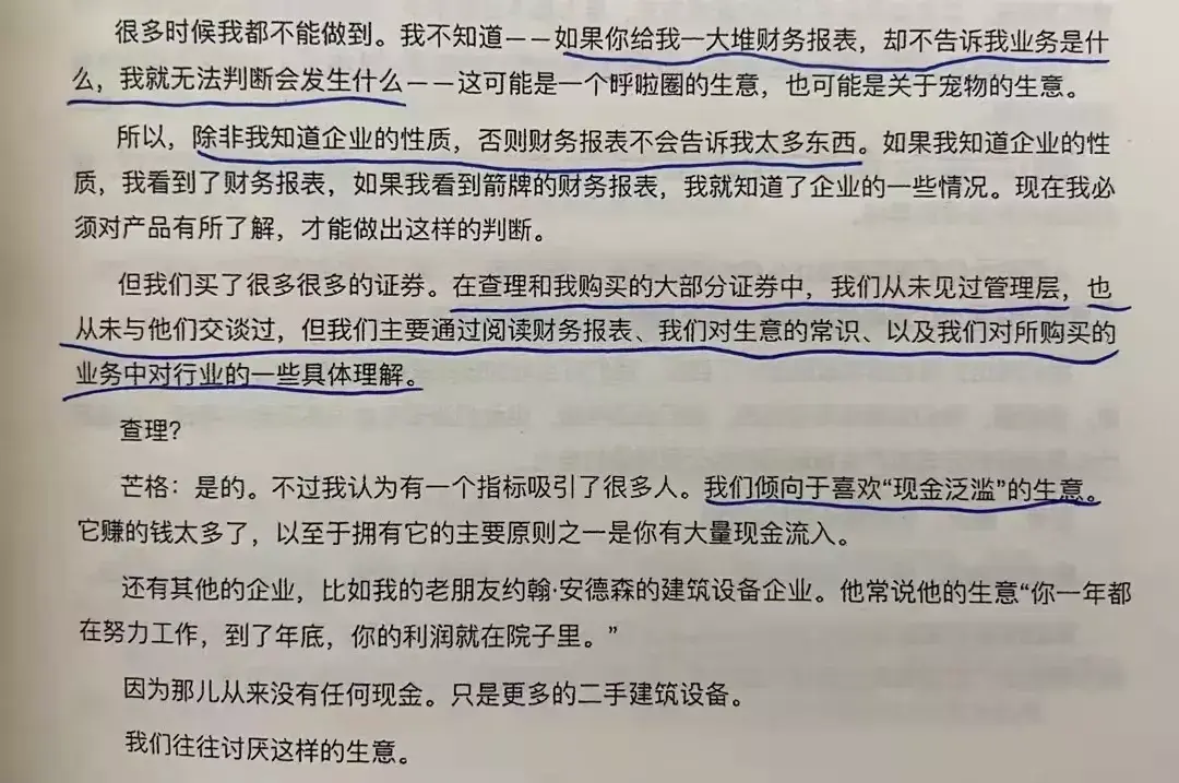 唐朝:在我们购买的大部分证券当中,我们从未见过管理层,也从未与他们交谈过,我们主要通过阅读财报、商业常识以及我们对具体行业的一些具体理解来作出投资决策。我们喜欢能创造大量现金的企业。不能创造现金的企业,管理层再优秀我们也不会买。三川二水:老唐至今未参加过非控股子公司的股东大会,这是要表明未来也(大概率)不会参加。张营:现金,现金,盯住现金。海海岁月:疯狂滴创造现金的企业才是值得购买的。