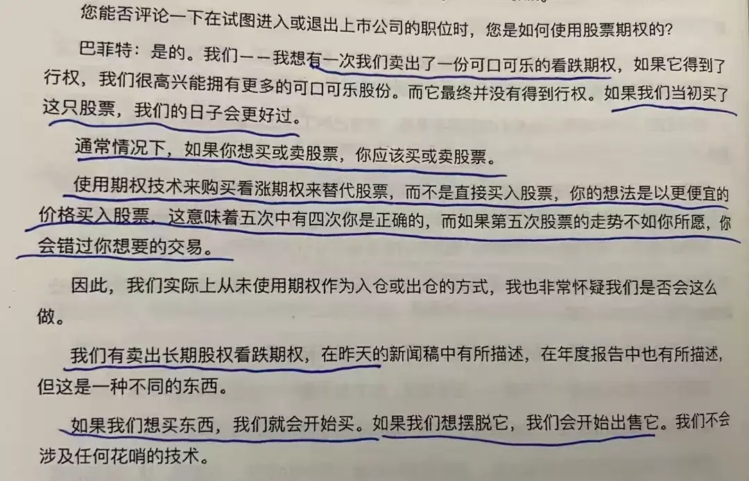 所以巴神的结论就是:我们现在不玩那些花哨的技术,想买东西我们就开始买,如果想摆脱它,我们就直接开始卖。这里有一小段说“我们有卖出长期股权看跌期权,但这是一种不同的东西”,它指的是跟保险一样的东西,收保险费承担某种概率的下跌风险,赚大数定律里的概率定价差,不是自己想低价买股票。