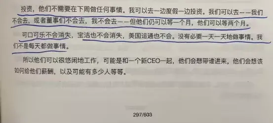 这一点段总说得很清楚,投资成功的旅程,能通到罗马的路很多,价值投资只是一条一定能到的路。 所以,千万不要认为自己是价值投资这一派,其他就是歪门邪道。AL:全靠老唐翻译,否则这本书大多数都看不懂。