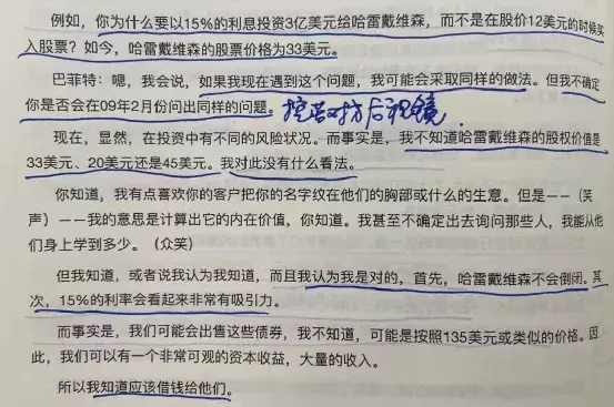 bp:不要以为黄头发蓝眼睛的人跟黑头发黑眼睛的人有什么不同,韭味是普世人性。木紫:为什么,为什么,这个问题在我周围经常能听到,我也不晓得怎么回答,回答了他们也不满意。Mark:只赚自己能看懂的那部分。巴老坦承自己不知道哈雷的股权值多少钱,但知道他们不会倒闭,能还得起债,所以愿意15%的利息借钱给他们。
