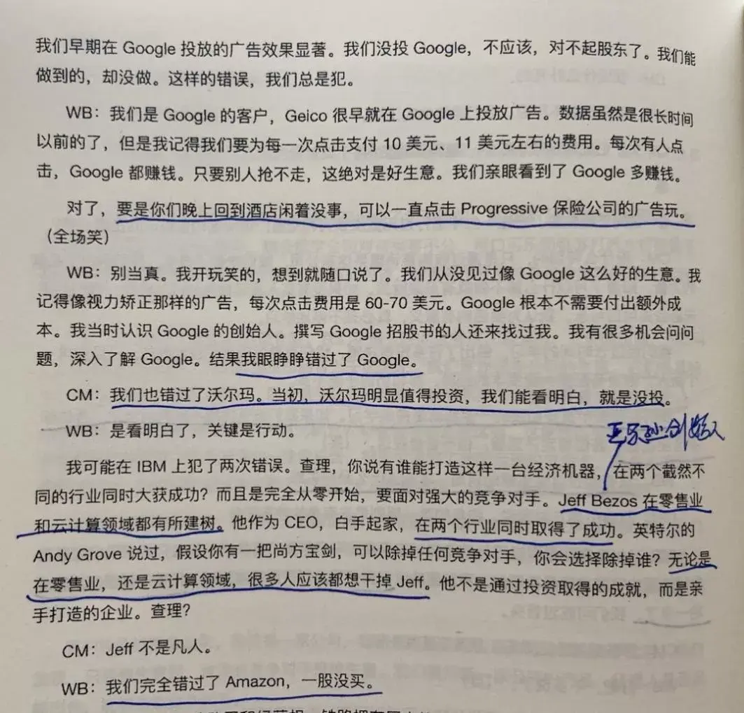 唐朝:二老反思自己应该抓住,却没有抓住的机会,这些损失实际上比那些亏了钱出去的损失更大,只不过人们通常不把它们算成损失:错过了Google,错过了沃尔玛,错过了亚马逊。刀刀:不过芒格还是觉得亚马逊业务太复杂,不是他们的菜。