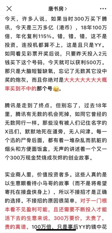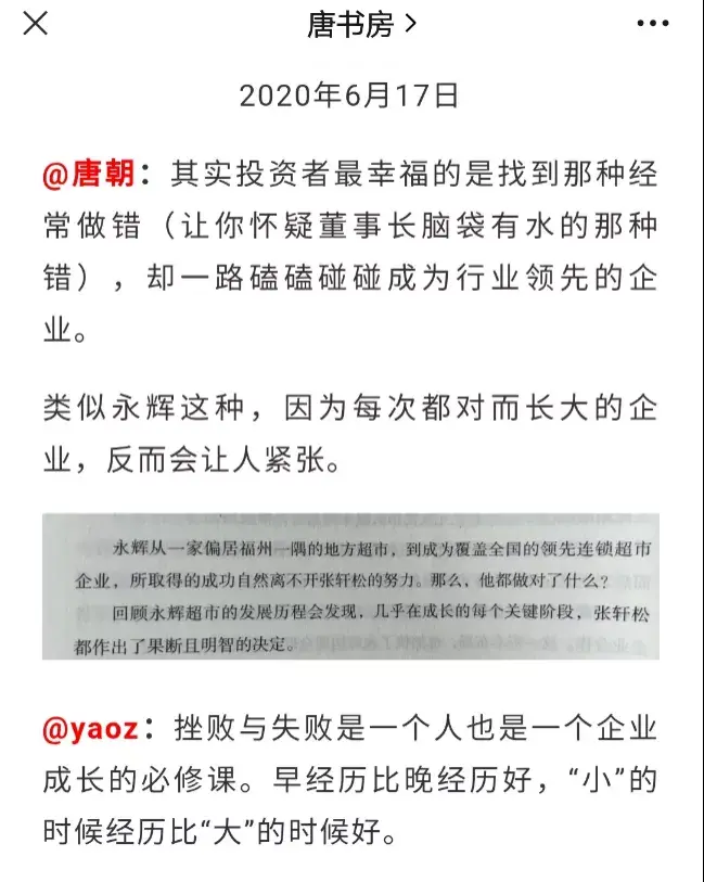 唐朝:记得我年初还是去年也发过一个类似的帖子,说类似永辉这样,因为步步都踏对而成长起来企业,其实是比较令人担忧的。最好的投资对象是那些昏招频出,结果还不断成长的企业。Lucy.lu:是的,在这里,书房拾遗13期。