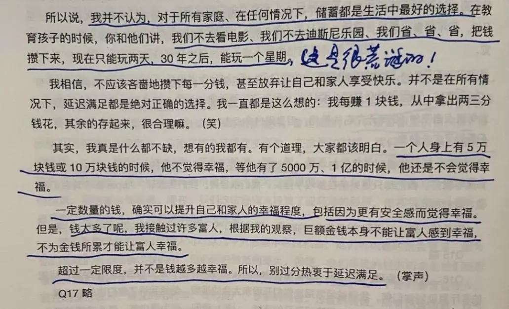 Alone:问题是现在我的金钱还远没有达到这里所说的限度,所以现阶段应该尽量节俭,然后复利,开源节流,复利,复利…Mr.Bigshot:完全同感,此生从未体会过金钱超过自己需求限度的情况,一直都缺钱,简言之,一直都很穷,必须需求一直没得到满足。跟着老唐,努力学习的目的就是为了得到这样的体会!翻石头的菜荚:唐老师又戳中我了。我父母都很节俭,自己有了小孩后,也不敢花钱了。本来分众的分红想给爸妈换手机,怕我妈生气,结果还是没买。