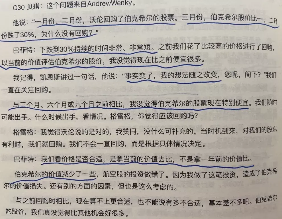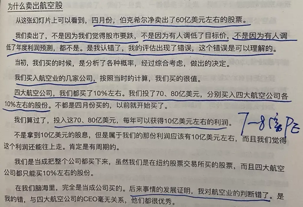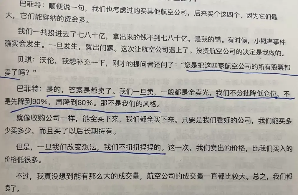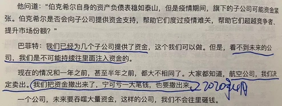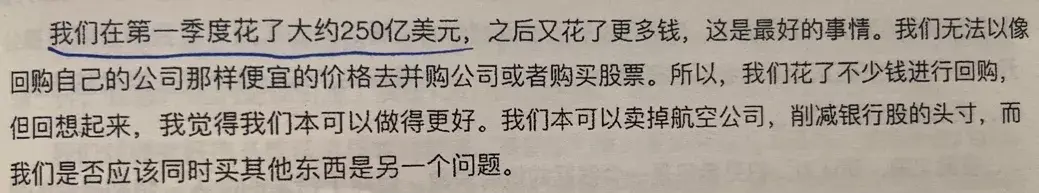唐朝:巴神没控股。当时是有那种舆论,说国家注资救航空公司,实际是曲线帮助了类似伯克希尔这种巨亨。舆论“有可能”会干扰政府决策,巴神的确也有点儿瓜田李下避嫌的想法。但我相信这不会是核心原因,核心原因还是巴神对航空公司未来的判断发生了改变。