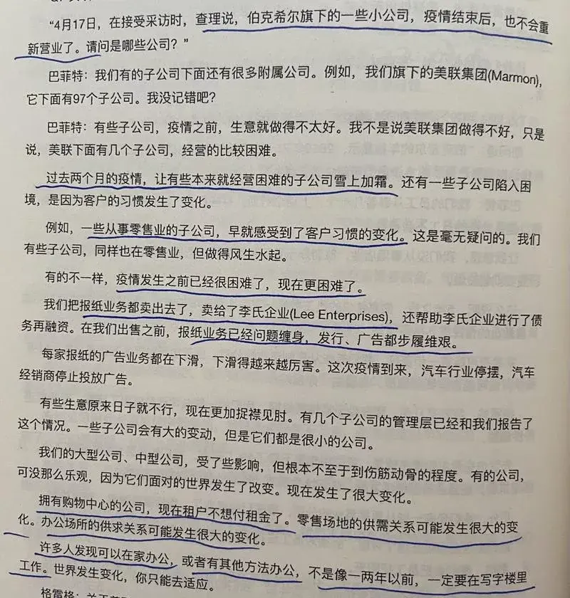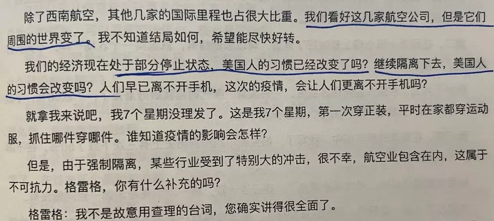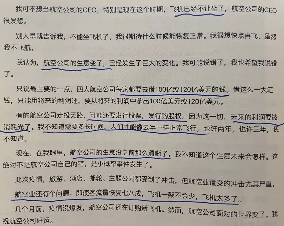 唐朝:巴神详细阐述他对航空业看法的改变:一是不知道什么时候恢复正常,二是此时不得不大量借钱或发行新股摊薄股东权益,三是无论多困难,航空公司的资本支出不会降低。不知道是巴神说漏了,还是他没有注意到的(应该是注意到了但说漏的概率比较大)。所谓的航空公司的生意没有之前那么清晰了,其中有个很重大的问题是,经过疫情的长期胁迫和培养,人们很有可能改变商务交流的模式。