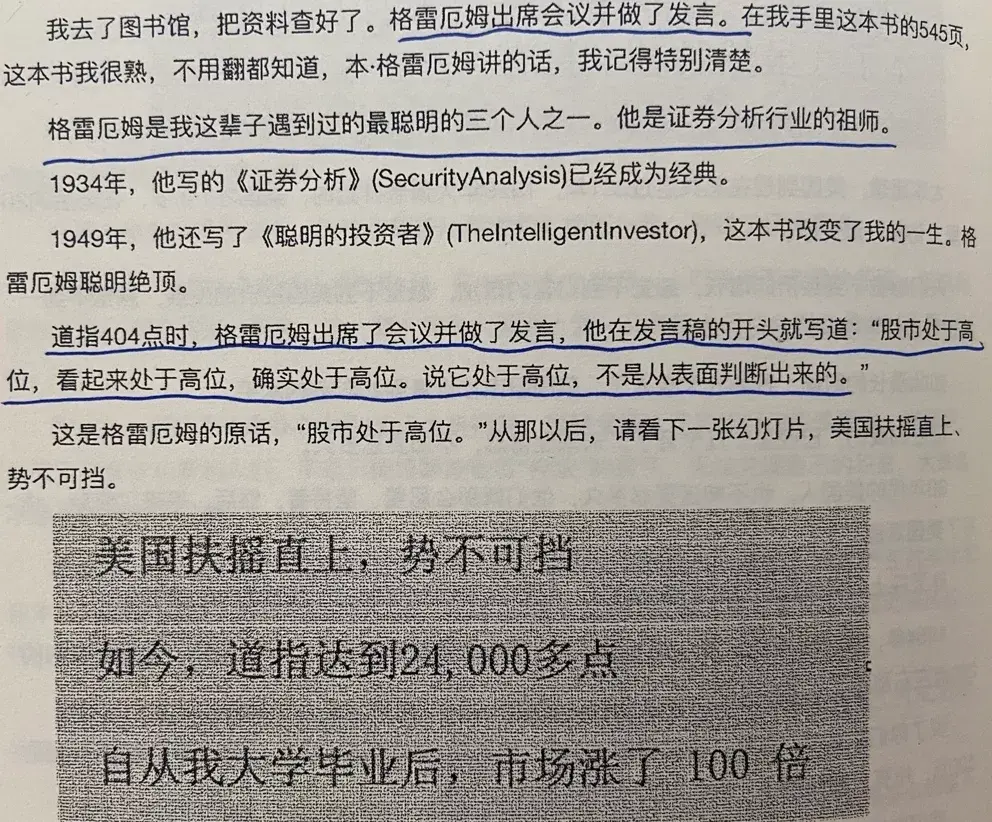 唐朝:巴神回忆:这辈子见过的最聪明的三个人之一,证券分析行业的祖师爷格雷厄姆,经过深入的研究之后,于道指404点时在国会发言,言之凿凿的说“股市处于高位,看起来是处于高位,事实也确实处于高位,这不是表面判断”。