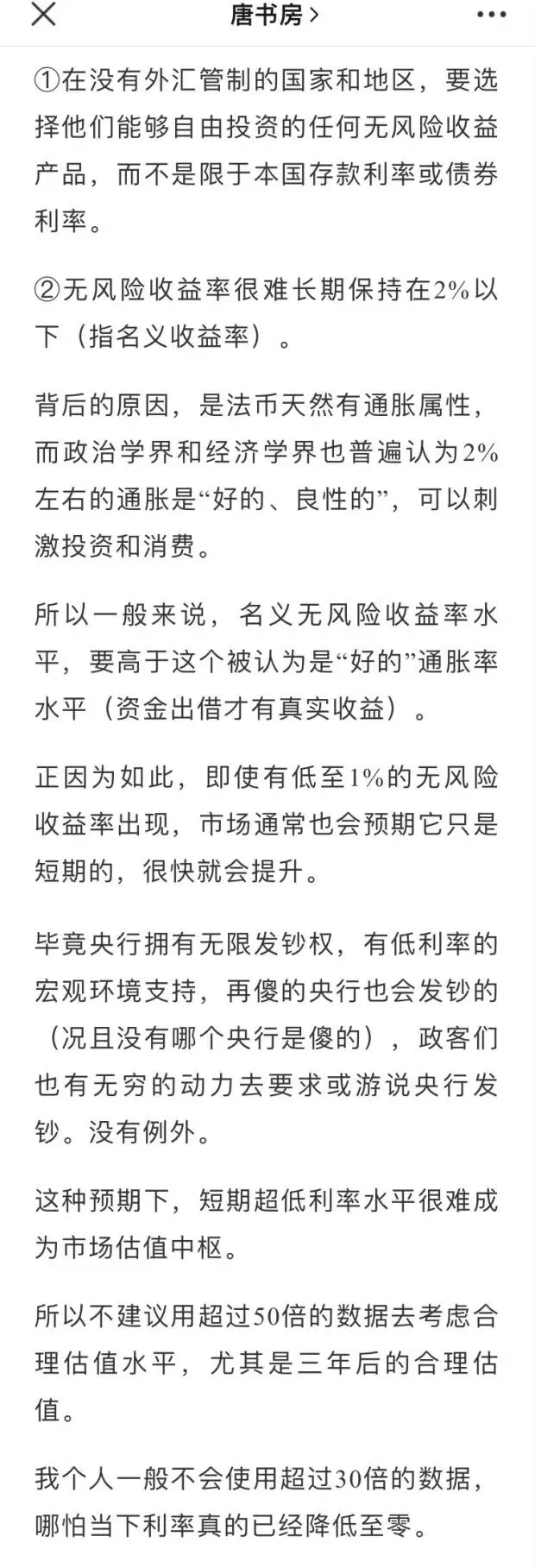 泊武:唐师我自己把自己绕晕了,搞不懂无风险收益率和利率是什么关系,不是一样的吗?唐朝:跟这个没关系。你是自己加了一句“马上提升”,“短期内会提升”。我原文没说过“马上提升”,我说的是“很快”,是相对于长期投资说的,是以年为单位的,超发货币,推高通胀,然后利率就会提升。