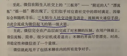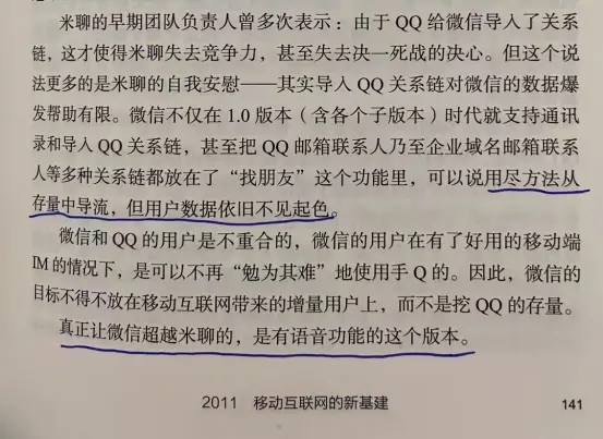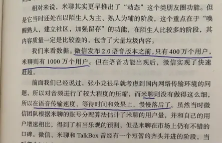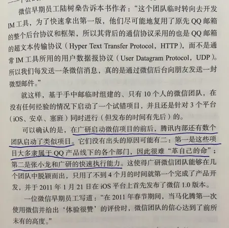ViV:微信最终是靠系统运维能力赢了米聊。张小龙在做微信之前,做了十年的腾讯邮箱,它有一个很强的功能是超大附件,要有强大的服务器功能保证,超大数据定点传输中负载均衡,系统不崩溃。