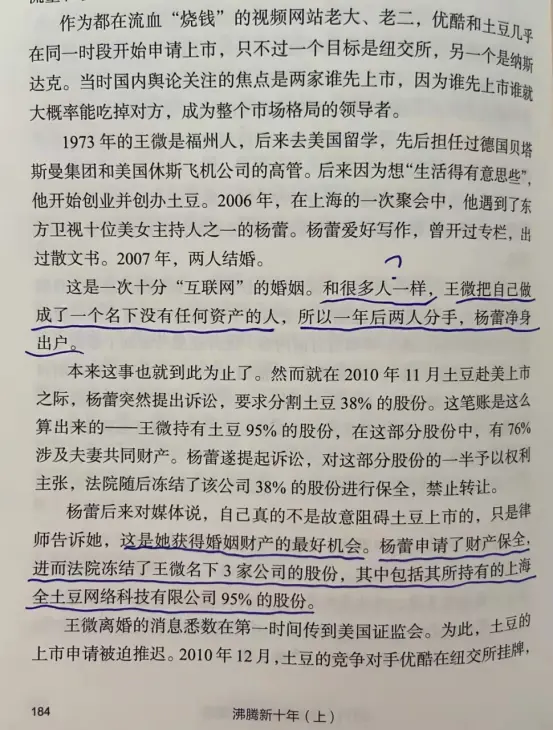 周明芃:王微是通过VIE架构持有公司股权,土豆内地实体叫“上海全土豆网络科技”,猜测通过不断的亏损把公司做成资不抵债,王微出轨后,与前妻杨蕾离婚才给人家10万元,而两人在上海的房子装修都是前妻出的钱,两年后杨蕾向上海法院起诉要求拿回35%的土豆股权,导致土豆上市遇阻,最后王微大出血给了700万。