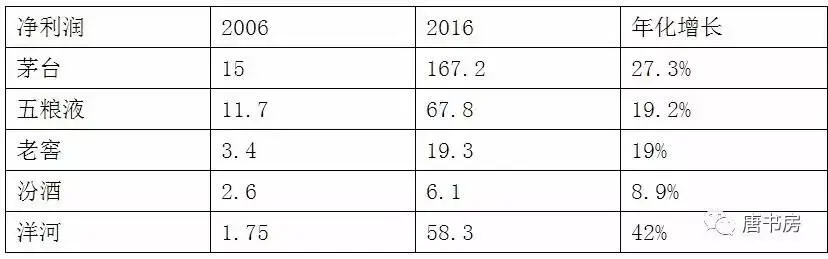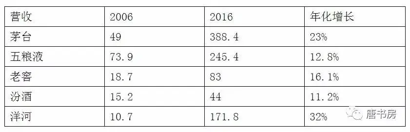 需要多长的赛道,才能看出真本事呢?套用老唐在2016年4月29日出版的《证券市场周刊》上发表的《解密洋河的高成长》一文模式,回看2006年至今几大名酒企的发展轨迹——选用2006年为起点,是因为洋河于2009年上市,可追溯的最早披露数据是2006年的(单位亿元)。
