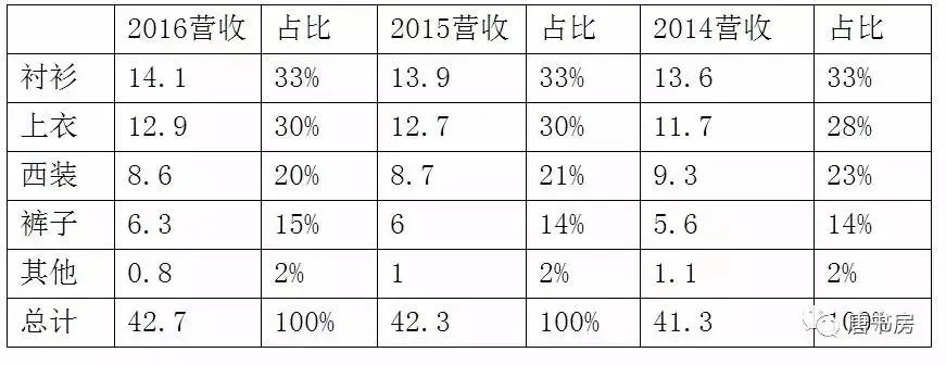 与印象不同的是,没看财报前,以为雅戈尔主要收入来自西装;看后才知,原来自产的衬衣和外包的上衣(夹克)才是雅戈尔的最大营收来源。这张表的结论很清晰,基本零增长,且产品结构也大体固定。几乎可以忽略的少量营业额增长,来自营业面积的扩大——2016年38.2万平方米,2015年34.9万平方米,2014年34.3万平方米。