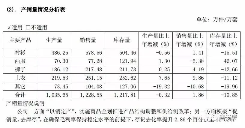 以这张表的数据和表末的说明看,公司2016年是控制了生产,以尽力消化库存,体现为每种品类当年生产量都低于销售量。然而,年末各品类库存量均远大于当年产量,接近于全年的销售总量,其中西服库存甚至超过一年半的销售量。