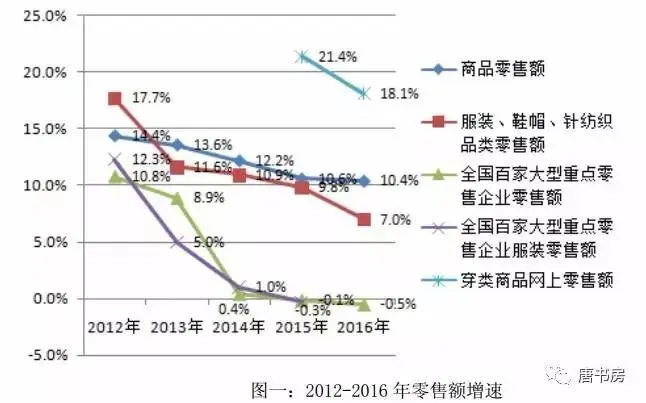 上图来自雅戈尔2016财报11页,图上展示的曲线可以说明这么几个问题:①红线代表服装鞋帽针织品零售额的增速,趋势是下滑,但增速依然超过GDP平均增速;②右上角蓝线,代表穿类商品网上销售增速较快;③左下角紫线,意味着“大型”服装企业增长远远落后于行业平均增速。