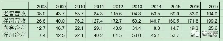 今天聊洋河和老窖。这是一对欢喜冤家,过去是、现在是、未来也是。下表是过去十年里洋河和老窖冲着白酒业小三位置比拼的成绩单。