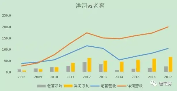 数据一目了然,2010年是两家公司的分水岭。那一年,洋河第一次在营收上超过了老窖,净利润恰巧一模一样。2010年之后,两者的差距越拉越大,到2017年,洋河营收是老窖的192%,净利润是老窖的259%。
