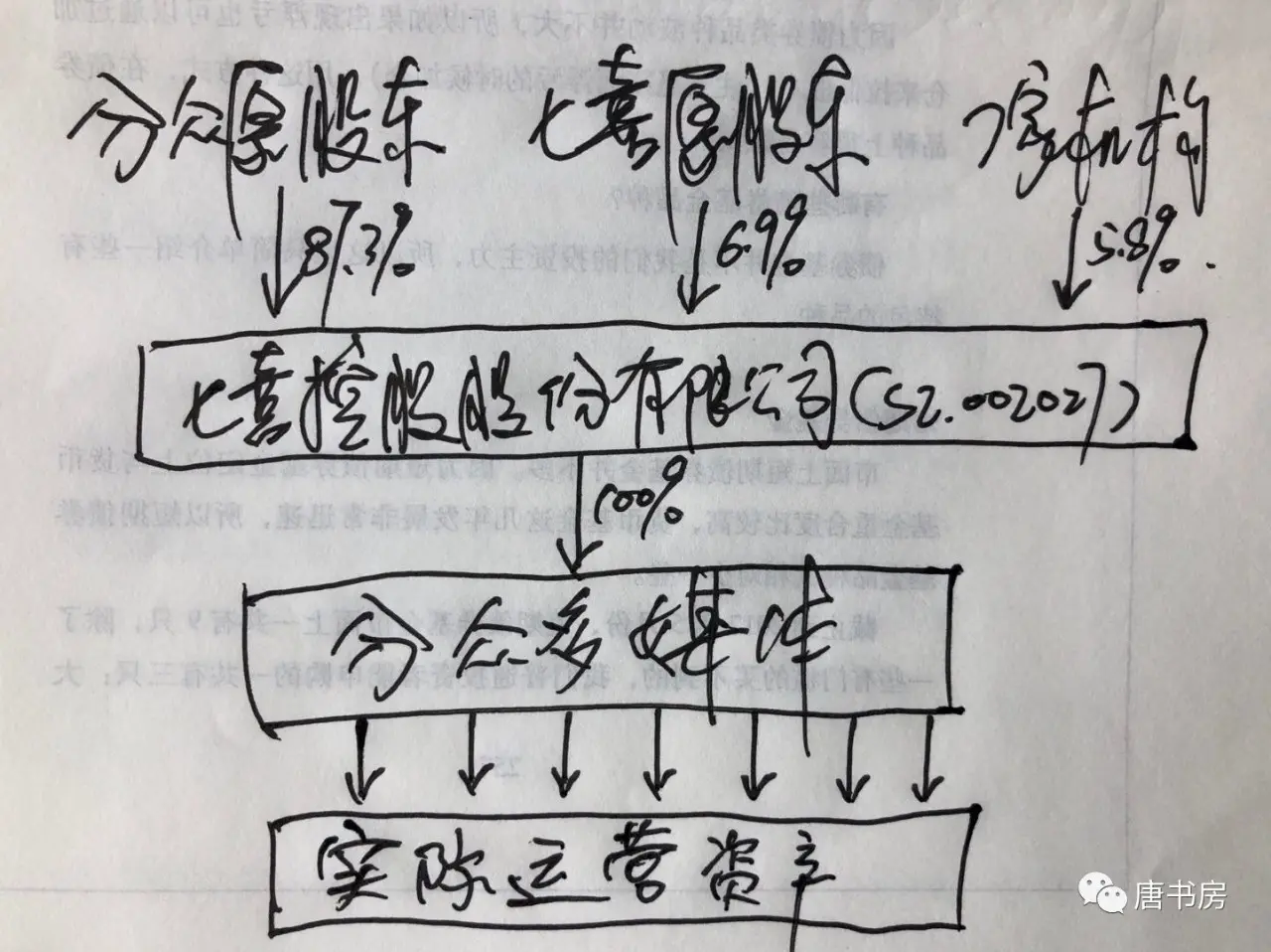如果不是为了获取“七喜控股股份有限公司这张营业执照附带的上市公司地位”,这次收购,严格的说是分众的股东向7家机构转让了5.8%的股份换来50亿现金,同时向七喜原股东发行6.9%的股份,收购了七喜控股股份有限公司。也就是说,会计上按照实质重于形式的思路认定的控股图是这样的: