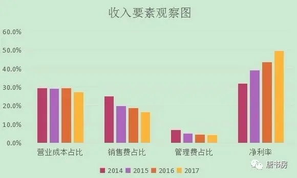 可以看到公司经营中的特点:营业成本稳中有降,毛利率稳定在70%以上;第二大成本因素是销售费用,总体趋势是稳定下降,是规模效应或提价能力的显现;由于固定资产较少,产生折旧也少,不是影响管理费用的主要因素,管理费用的主要构成为人员薪酬和房租,总体占较小;最终结果是净利率稳步提升,增幅超过营业收入增幅。