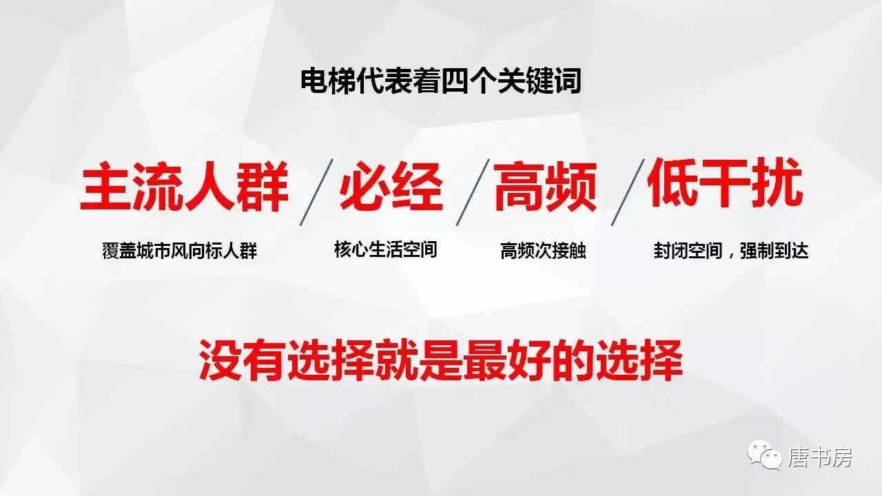 ①强迫。大多数情况下消费者在看节目或内容时并不想看广告。消费者的预期是看内容,穿插其中的广告成为打断收看的干扰因素,心智天然地产生排斥。但是,在等电梯和电梯内的时间,消费者反而会主动看广告。因为在这个狭小空间内,广告是利用了消费者本来需要打发的“多余”时间,而不是霸占消费者的有效时间。此时看广告是消费者主动寻求打发无聊的解决方案。