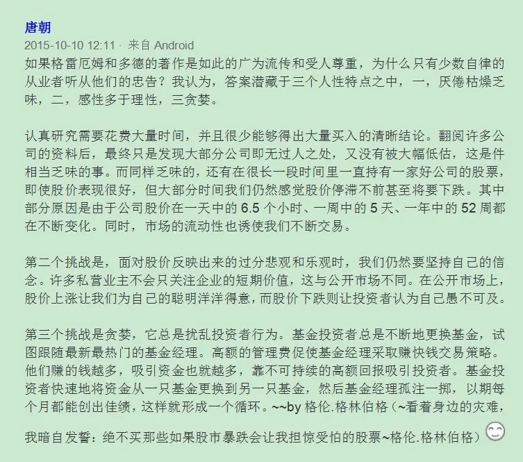 没想到去年老唐应邀为祖师爷本杰明.格雷厄姆的经典巨著《证券分析》第四章写导读时,巧遇格伦.格林伯格先生为该书第五章写导读,缘分啊。
