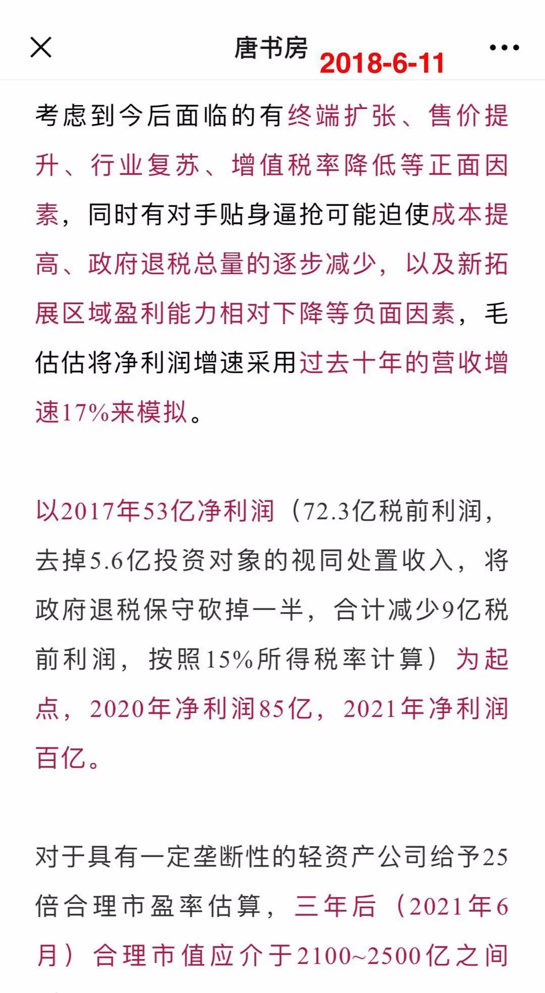 在这个假设下,老唐推测三年后分众的可能盈利时,只考虑了增速高低,没有考虑下降可能:直接采用2017年的扣非盈利基数,并以17%的增速做了模拟,得出2021年净利润百亿,估值2100~2500亿的结论,由此得出1050~1250亿之间买入的决策。