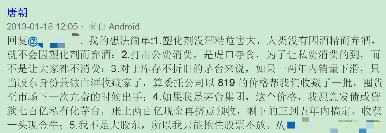 关于这个问题,老唐在2013年初行业最萧条时就发表过如下观点:“3.对于库存不折旧的茅台来说,如果一两年內销量下滑,只当股东身份兼做白酒收藏家了,算委托公司以819的价格帮我们收藏了一批,囤货至市场下一次亢奋的时候出手”。