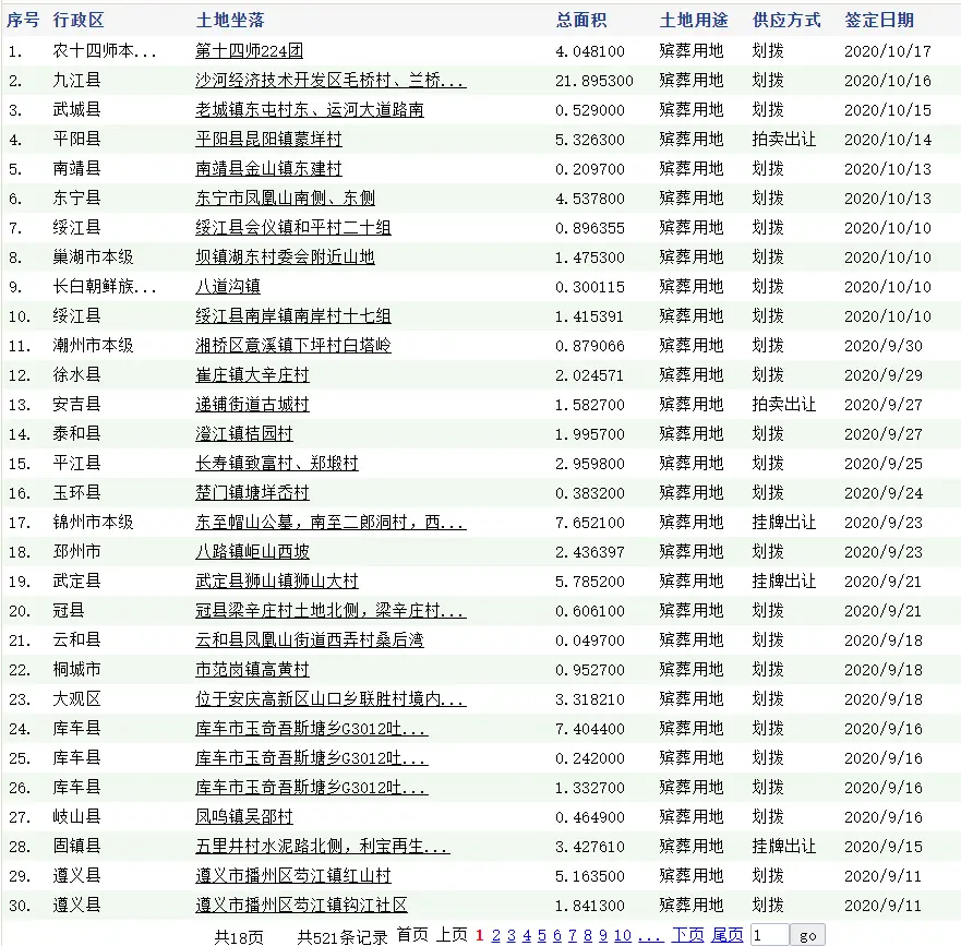 今天我们登陆自然资源部不动产登记中心旗下的中国土地市场网,查询殡葬用地,我们会发现绝大部分依然是划拨方式,拍卖和挂牌出让占比至今仍然极小。