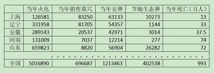 注释:从①之后的数据口径略有偏差。这里的70对应的是当年全国销售墓穴696687个,但它不一定刚好等于当年安葬人数。