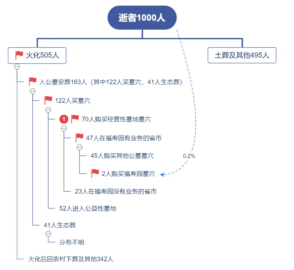 让我们从2018年全国死亡人数993万开始(假设为基点1000),重新捋一遍本文的数据,我们会发现这样一个逐步分流的图表: