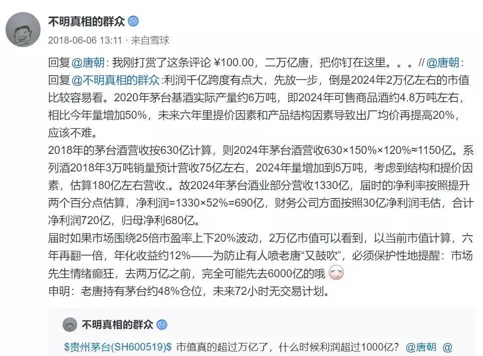 至于市场舆论,其实永远都是那个蠢样子,从未改变2018年6月,老唐说茅台2024年到达2万亿市值,是比较容易看到的事情。被铺天盖地骂吹票、骗韭菜站岗