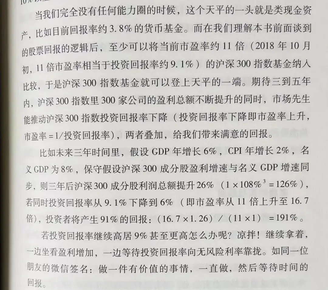 而在我们理解本书前面谈到的股票回报的逻辑后,至少可以将当前市盈率约11倍(2018年10月初。11倍市盈率相当于投资回报率约9.1%)的沪深300指数基金纳入比较,于是沪深300指数基金就可以登上天平的一端。