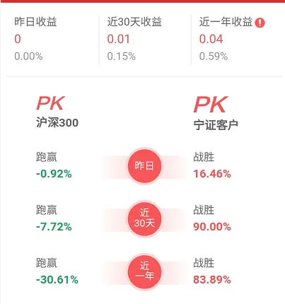 最近一个月以0.15%的收益率跑赢90%的客户;最近一年以0.59%的活期利率,跑赢83.89%的客户。