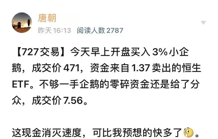 【727交易】今天早上开盘买入3%小企鹅,成交价471,资金来自1.37卖出的恒生ETF。不够一手企鹅的零碎资金还是给了分众,成交价7.56。