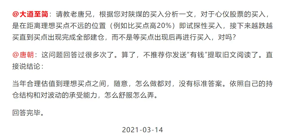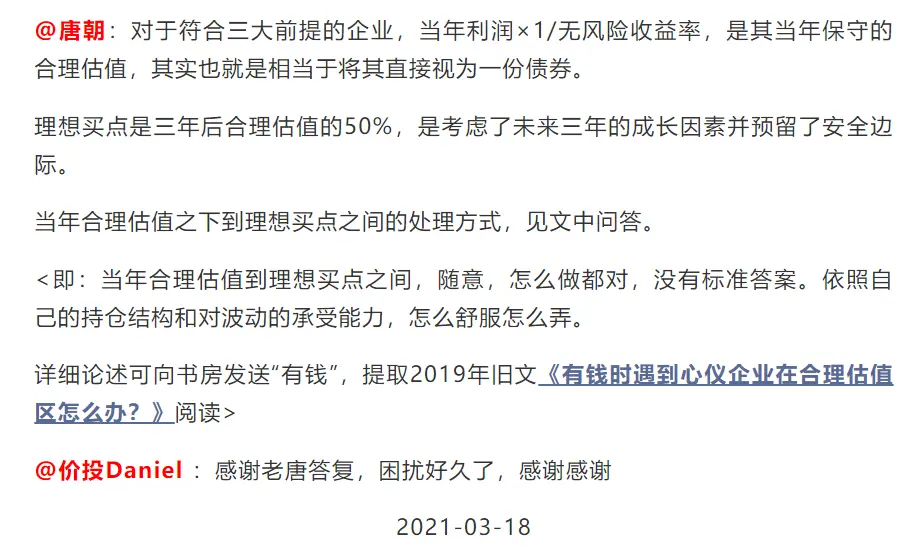 我不仅在2019年7月25日的《有钱时遇到心仪企业在合理估值区怎么办?》一文讲过这问题,还在2020年12月17日的《老唐估值法答疑之再续》里,更直白的阐述过。我拷贝原文过来吧!
