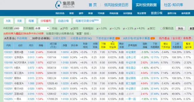 21)采用长持收息手段,选择分级A的流程非常简单。登陆集思录网站http://www.jisilu.cn/(这是国内分级数据最齐全的网站)。然后点击“实时投资数据—股票分级”,你将会看到一个这样的页面