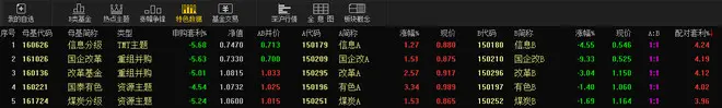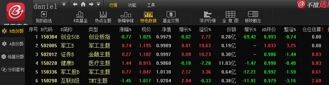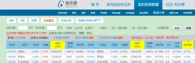 也可以在诺亚方舟软件里“特色数据—分级套利—配对套利”排序看到。其中“净值”和“AB并价”之间的差额,就是我们套利的空间,这个数据,当然是越大越有价值了。必须注意,这个溢价空间只是估计(因为母基实时净值是推算,要晚上基金公司才会公布准确净值),会有少许差异的,操作时必须留有富裕空间;