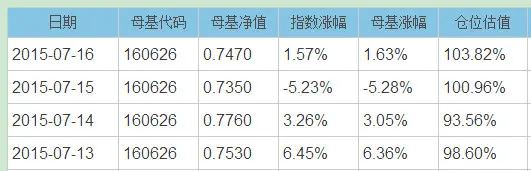 注意,这两处都是用的估算。因为基金的仓位只有在年报季报发布时,才会公开,平时并不实时公布。好在由于基金挂钩的指数波动和净值波动,是每天都可以得到的数据,由这两个数据,可以大致推算出基金的仓位。比如集思录截图中160626的7月13日母基涨幅6.36%,而挂钩指数涨幅为6.45%,由此得出仓位约6.36/6.45=98.6%。但这种估算,也有缺陷。还是这张图,7月16日,估算仓位103%。实际上可能是基金经理日内有高抛低吸动作,造成净值增长超过指数增长情况(指数基金不会融资的)。这个仓位可以作为决策参考,但要留有一定的余量,毕竟在极端设想下,基金经理可能会在半日内从空仓变满仓的;