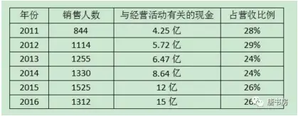 3)费用占比继续压缩,难度很大。厨房电器产品差异较小,属于销售推动型,在竞争中,费用投入一旦控制过低,销售额就会大受影响。这一点,我们可以从公司销售人员数量及现金流量表里支付的其他与经营有关的现金数量(主要是广告费、销售服务费、展台装饰费、宣传促销费等)看出来