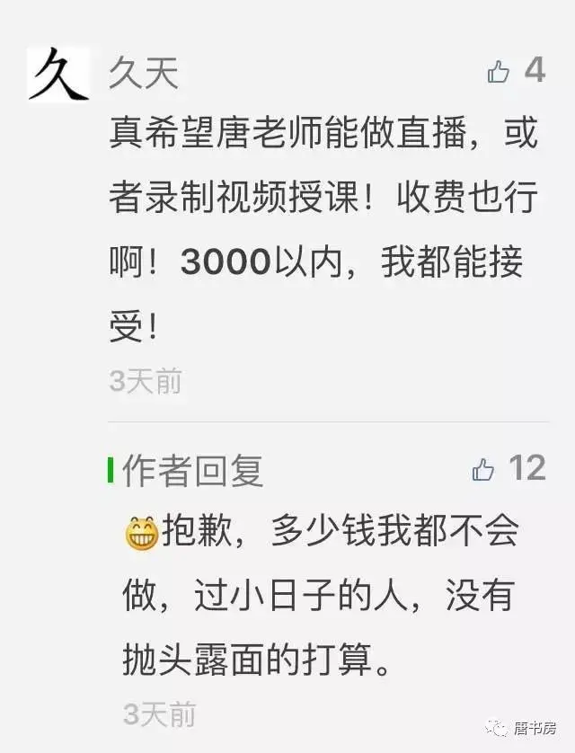 6月24日,老唐发表了《生人勿近雅戈尔》上中下三篇文章后,当日,读者久天留言建议老唐搞直播或录视频,说3000以内愿意付费。老唐回复说,多少钱都不做,过小日子的人,没有抛头露面的打算。