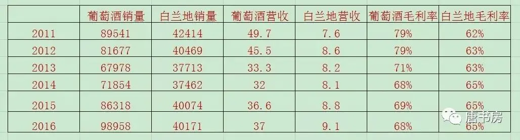 2011年销售8.95万吨葡萄酒,营收49.7亿,不含税出厂吨价5.55万元。而到了2016年,吨价降低为3.75万元左右。消费群体下移了;而白兰地,则走出来相反的轨迹。2011年,吨价约1.8万,到2016年,吨价变成约2.27万元,消费群体上移了。