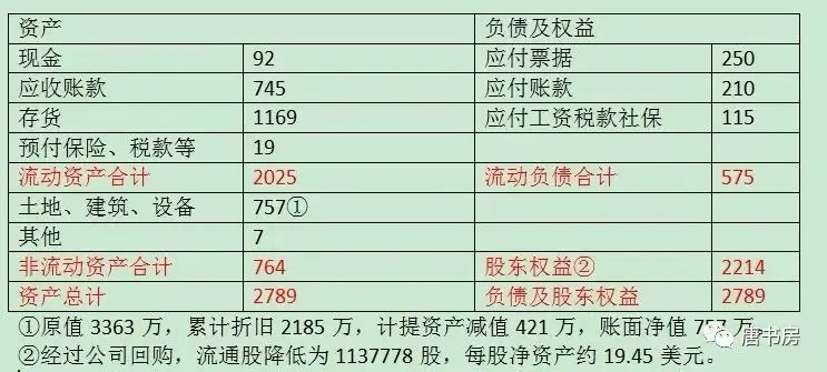 每股净营运资本约12.75美元,每股净资产约19.45美元。按照12月2日书房推送的《经典烟头案例拆解》里巴菲特的惯用估值手法(还记得那张给风车公司估值的表格吗?),按照现金及债务100%,应收85%,预付25%,存货、工厂和设备一律60%的估值比例算,公司估值约1290万美元,每股约11.35美元。