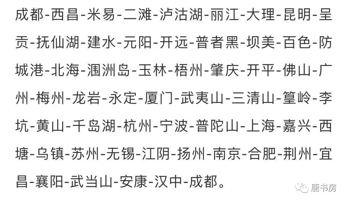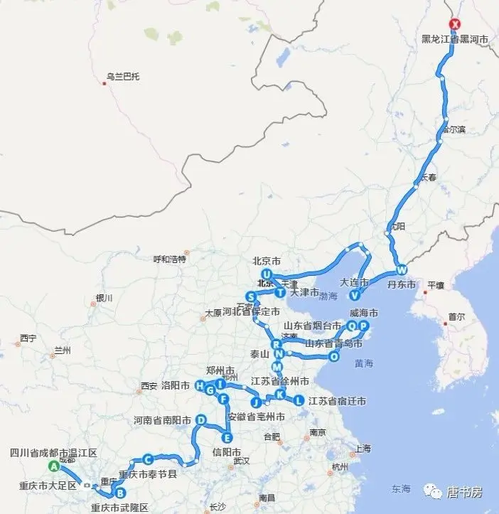途经城市:成都—大足—武隆—巫山—南阳—信阳—驻马店—登封—洛阳—郑州—开封—亳州—徐州—宿迁—曲阜—青岛—威海—烟台—蓬莱—泰安—济南—石家庄—保定—天津—北京—承德—秦皇岛—营口—大连—丹东—沈阳—四平—长春—哈尔滨—五大连池—黑河。