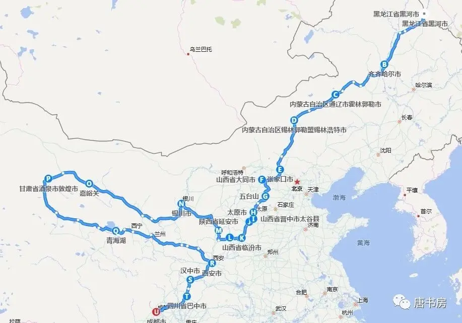 途经城市:黑河—齐齐哈尔—锡林浩特—张家口—大同—五台山—太原—祁县—平遥—临汾—壶口—延安—银川—张掖—嘉峪关—敦煌—青海湖—西宁—兰州—宝鸡—西安—汉中—巴中—成都。
