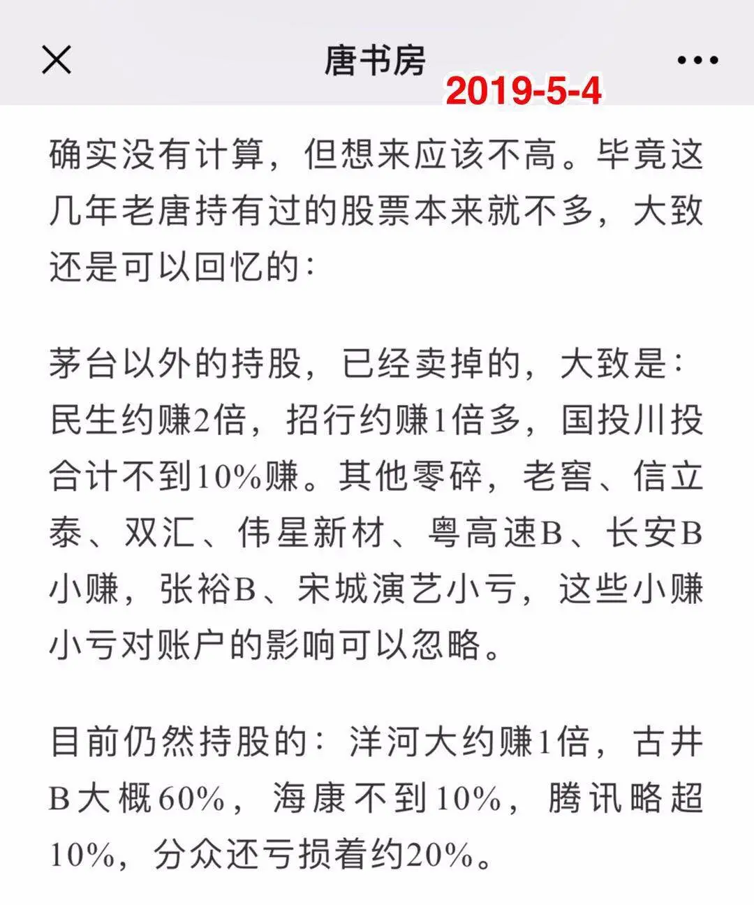若只是蹭个热点,或者骂骂老唐过个嘴瘾,甚至只是为了明示或暗示自己比老唐高明的,就随他们爽去吧!谢谢当前,老唐持股茅台42%,腾讯26%,分众11%,洋河10%,海康6%,古井B6%,2019年内收益30%。